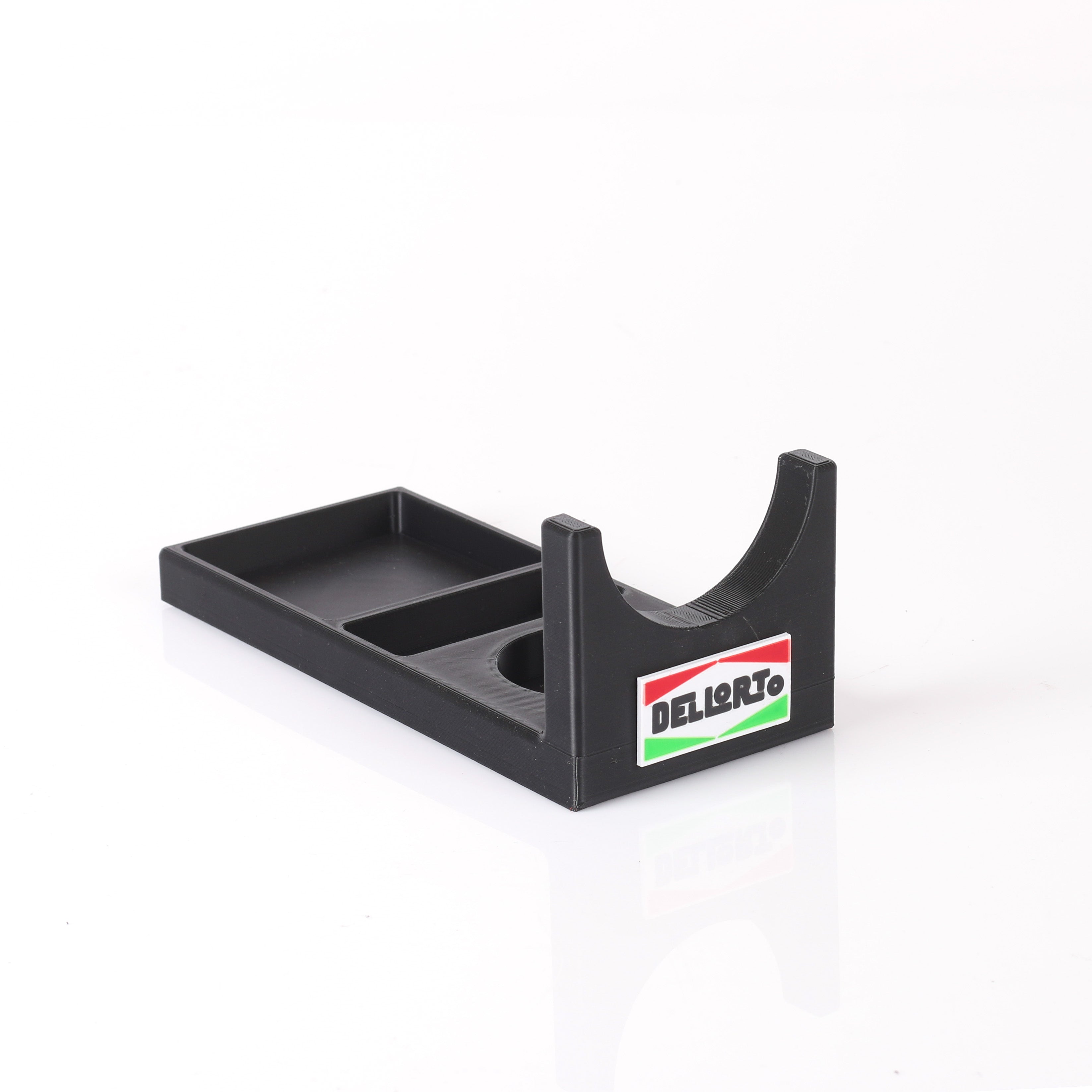 Stället är tillverkat i plast och har inbyggda magneter som gör att det står stadigt på mekbordet, även vid arbete. Med Dellorto-logotyp för en professionell känsla.
